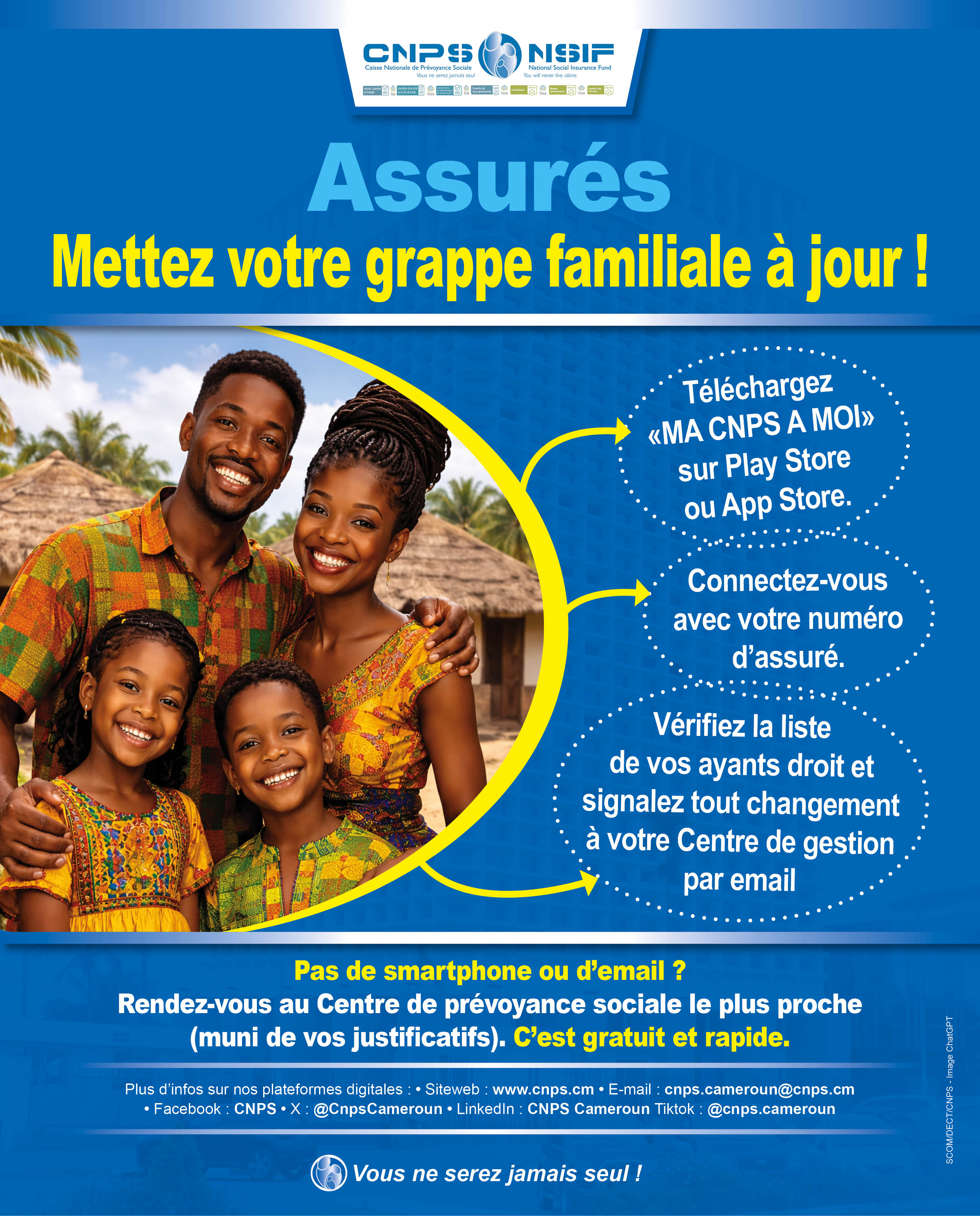 La mise à jour profite à toute la famille : à l’assuré (versements rapides, justes, sans mauvaise surprise) ; à ses proches (ils toucheront les prestations le moment venu) ; à la CNPS (moins de dossiers en instance, moins d’enquêtes sociales à mener).